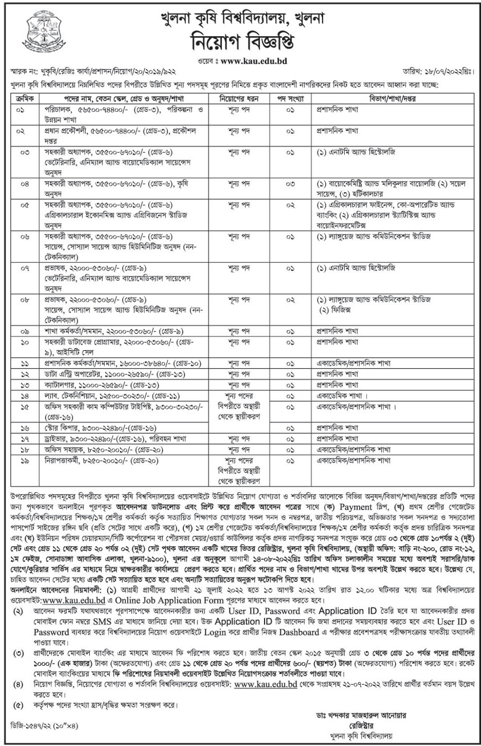 Khulna Agricultural University (KAU) Govt Jobs opportunity for all employed and young people. KAU Job Circular Apply link and injunctions are given below on this page. HSC pass, Graduate pass Diploma pass candidates are suitable to apply KAU online apply. Submit your job appeal Khulna Agricultural University KAU Job Application Form on the KAU website kau.edu.bd. You can get a Bangladesh Govt. Job by KAU online application.