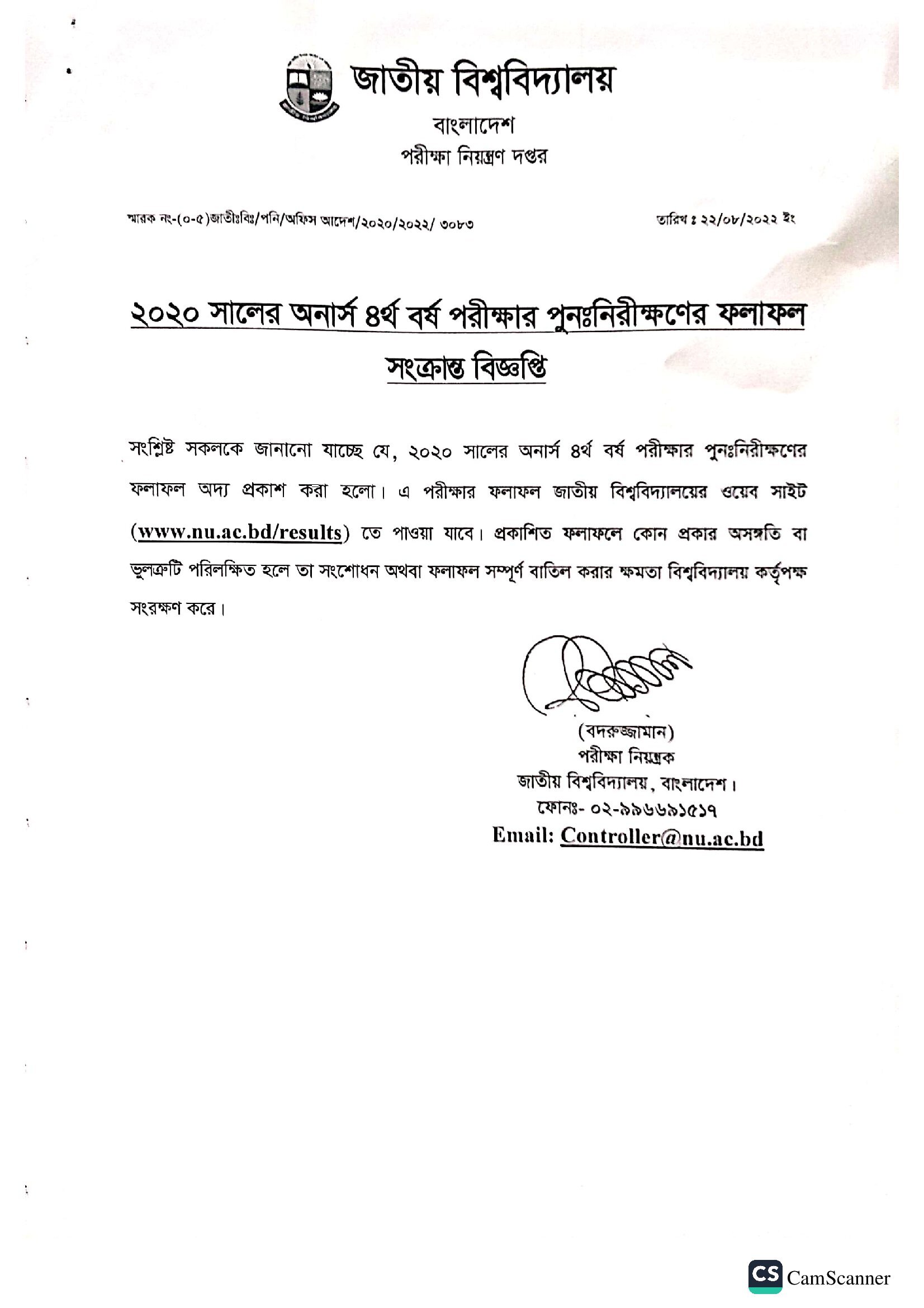 ২০২০ সালের অনার্স ৪র্থ বর্ষ পরীক্ষার পুনঃনিরীক্ষণের ফলাফল প্রকাশ সংক্রান্ত বিজ্ঞপ্তি।