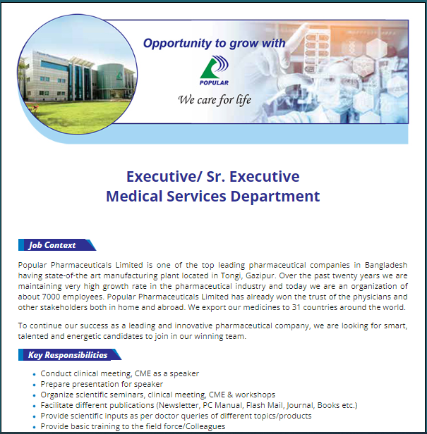 Popular Pharmaceuticals Ltd Job Circular 2022. Recently published Popular Pharmaceuticals Ltd Job Circular. Popular Pharmaceuticals Limited is one of the largest industries in Bangladesh. You can get all of the information like job full details, applying process, and more From Jobsnotice24 Website and Apply Now!! We also published everyday different job notices for Popular Pharma jobs. New Popular Pharmaceuticals Ltd Job Circular.
